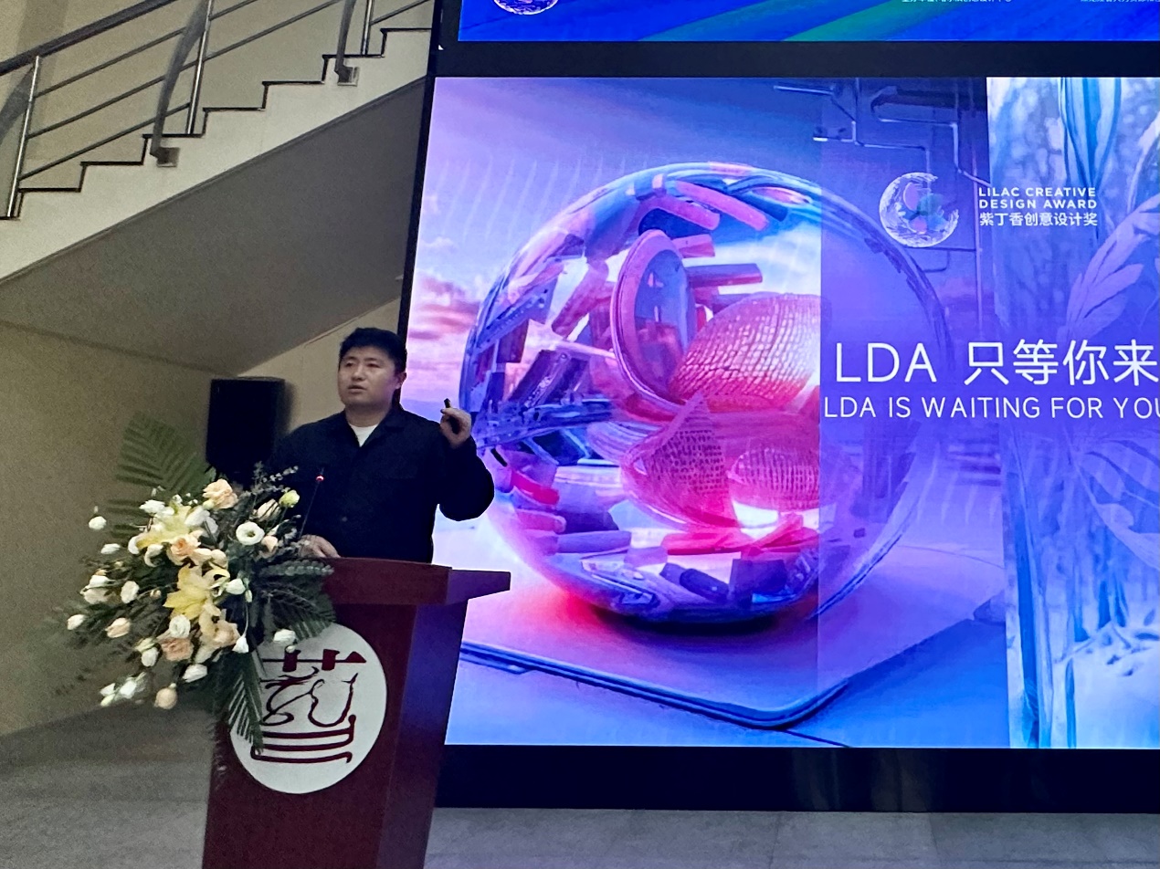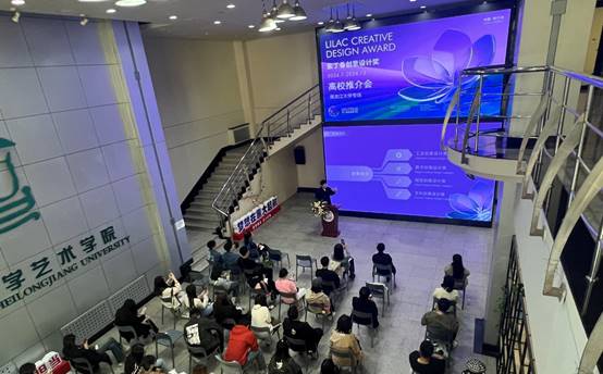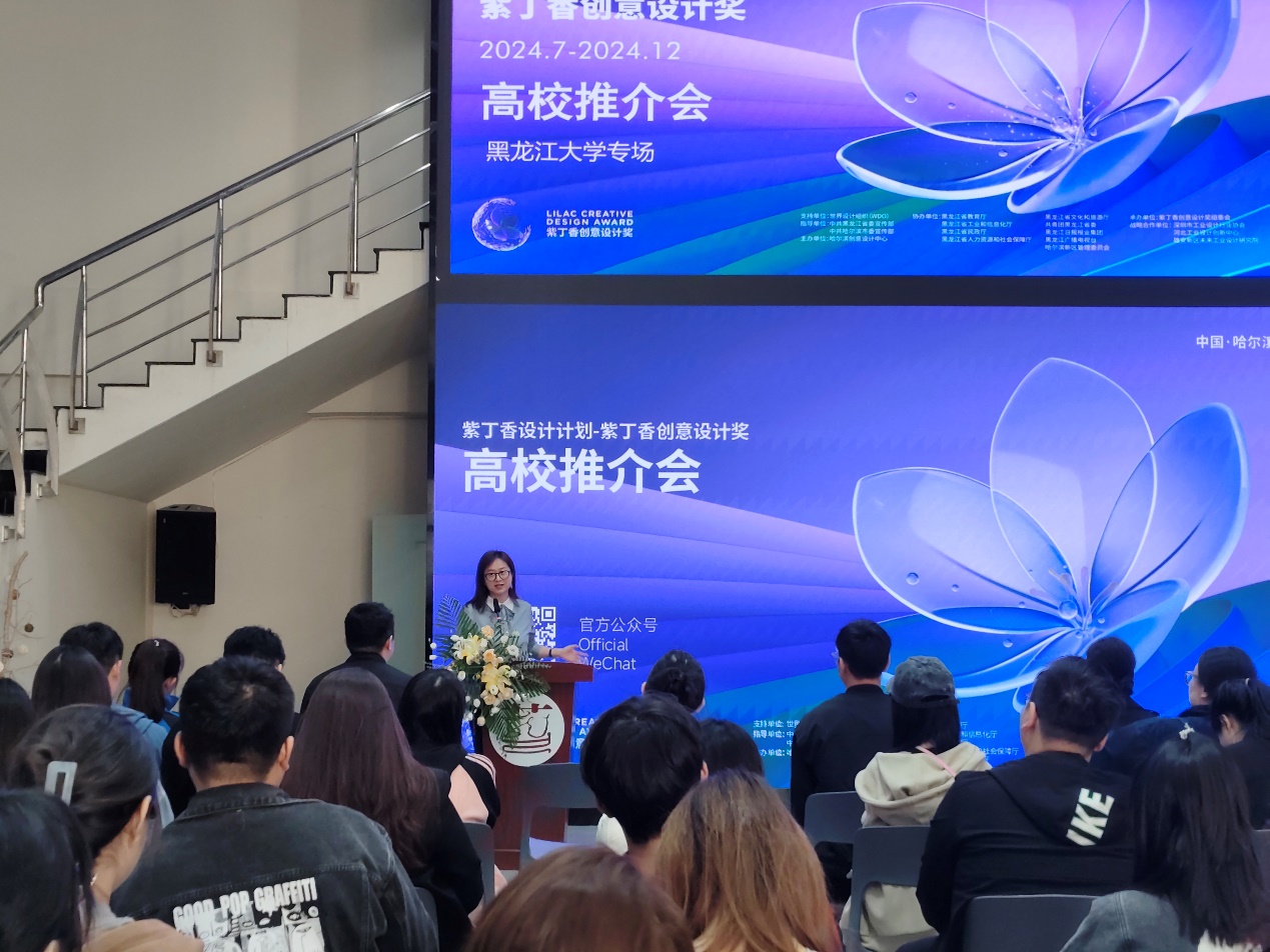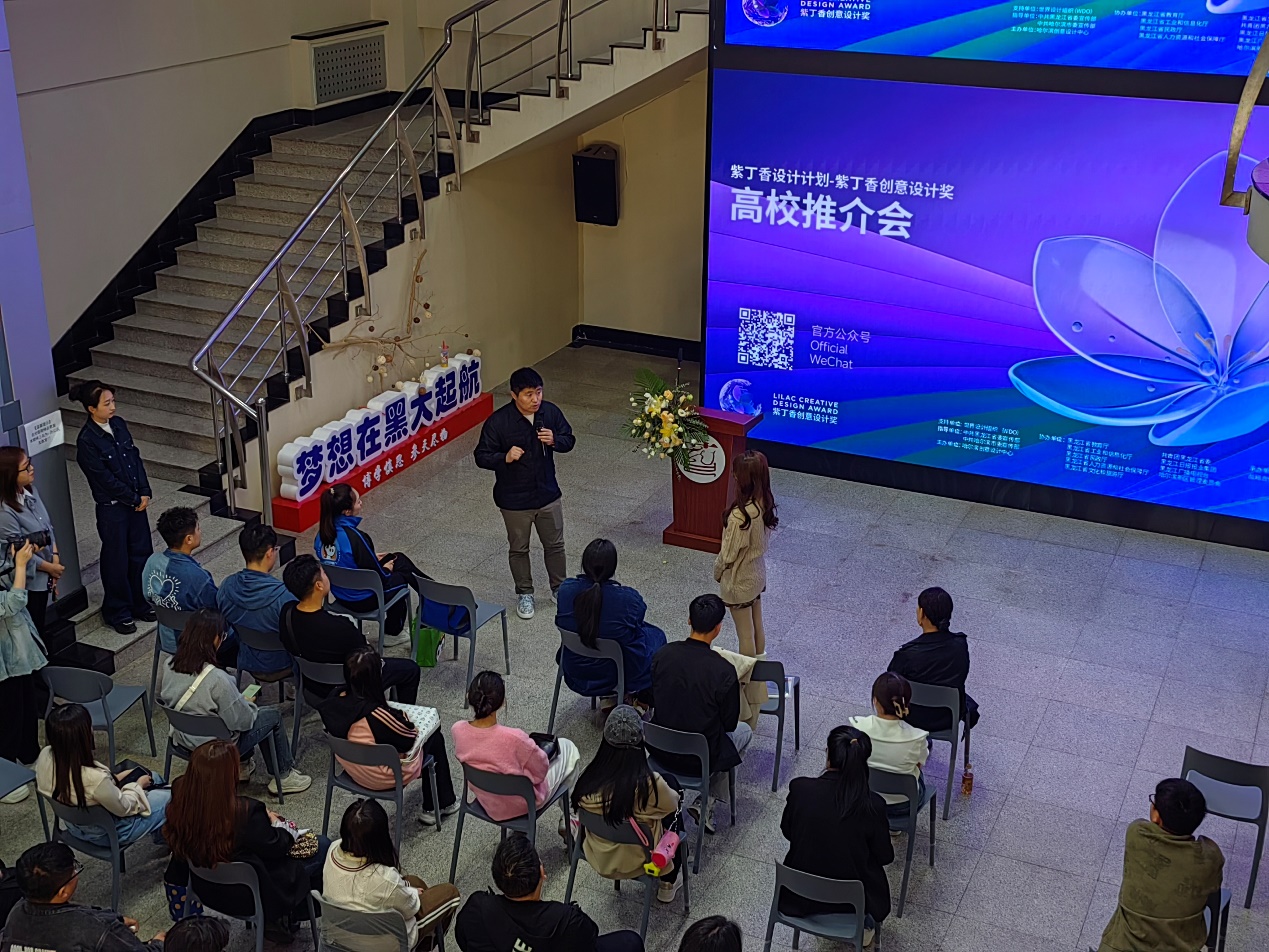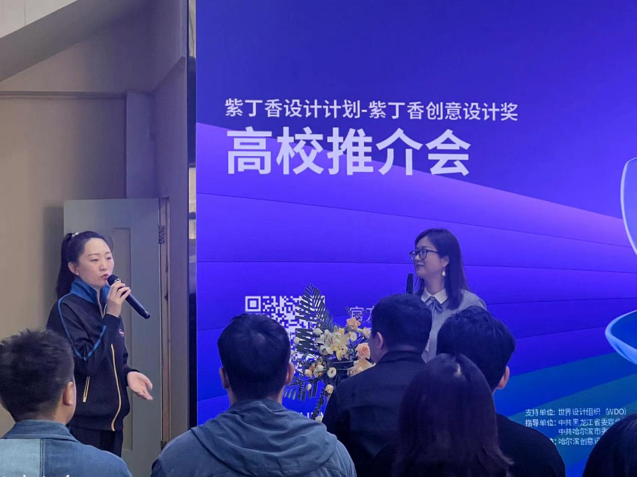 哈尔滨创意设计中心副主任闫实从七个方面介绍了紫丁香创意设计奖,分别是奖项介绍、赛事流程、奖项设置、参赛类别、评审专家、赛事价值、成果转化。介绍结束后,在场师生积极对相关专业问题题目,哈尔滨创意设计中心副主任闫实为同学们的提问进行专业性解答。