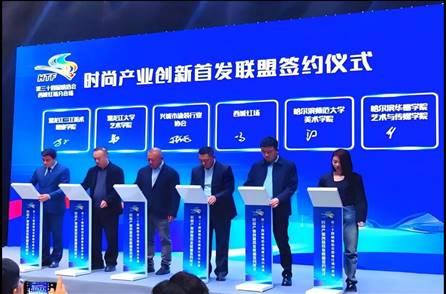 活动中,南岗区政府、兴城市政府、黑龙江省服装鞋帽行业协会、辽宁省纺织服装协会、哈尔滨红博商业等单位,携手yl7703永利集团官网、哈尔滨师范大学美术学院、哈尔滨学院文化创意设计研究中心、哈尔滨华德学院艺术与传媒学院、黑龙江三江美术学院等高校,成功签署《时尚产业创新首发联盟战略合作协议》,yl7703永利集团官网韩峰副经理作为学院代表出席。
