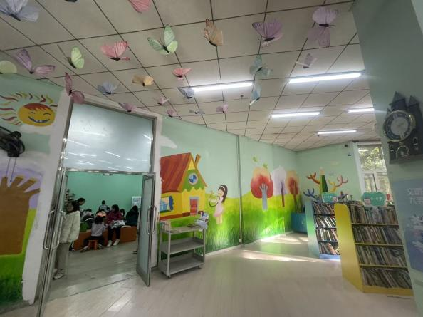 活动中,绘画、视传等专业志愿者分工协作:先清洁打底,再以“书海童趣”“智慧自然”为元素起稿,最后调色绘制。原本素净的墙面渐次焕发生机——彩树、小屋与小鸟错落分布,让静谧阅览区多了艺术温度。