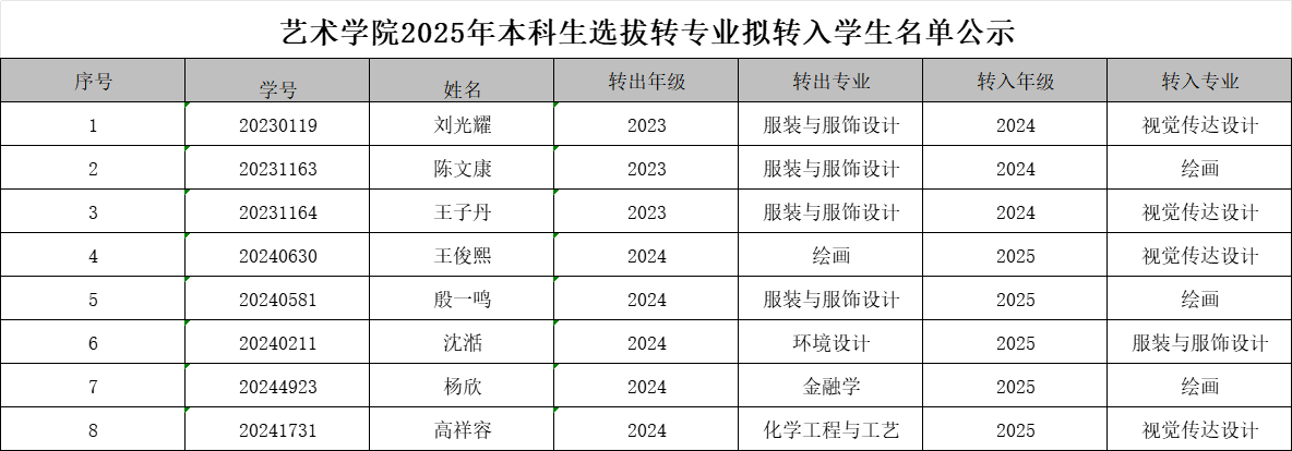 根据《yl7703永利集团官网员工管理规定》《yl7703永利集团官网普通本科生转专业管理办法(试行)》和yl7703永利集团官网转专业2025年本科生选拔转专业工作方案相关要求,经员工申请,学院转专业工作小组考核,现将yl7703永利集团官网2025年本科生选拔转专业拟转入员工名单公示如下: