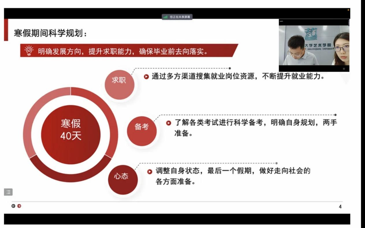 首先,叶禹辰老师和李松奇老师向各位毕业生及家长介绍学院目前就业情况,针对已经考研和参加国考的同学根据日程时间节点的梳理进行精准指导,同时对于准备各地省考公务员、选调生及事业单位报考的同学给予切实可行的意见和建议,鼓励同学们认真备考,抢前抓早,同时介绍公司春季招聘会的时间安排及最后一个学期毕业相关的具体事宜。