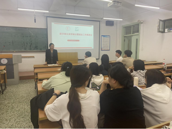 在分专业的六个会议上,叶禹辰老师首先根据各专业当前的就业形势以及同学们所填写的就业意向调研数据,向同学们分析目前的就业局面,同时进一步介绍了本专业历年的就业情况包括公考、选调生、保研推免、考研、出国等,帮助大家更好的确定自身规划,修正就业意向、找准努力方向。同时,与同学们介绍学校学院整体的就业工作安排情况,近期招聘会的时间安排等,讲解黑大就业公众号使用指南、云就业平台网签系统使用说明,鼓励毕业生抓住“金九银十”的求职黄金期,积极关注就业资源信息,主动出击。
